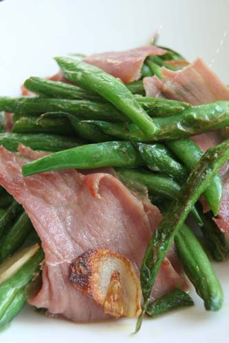 Remove the pan from the heat. Shred the pieces of jamon into large slices with your hands. Toss them with the green beans and serve.